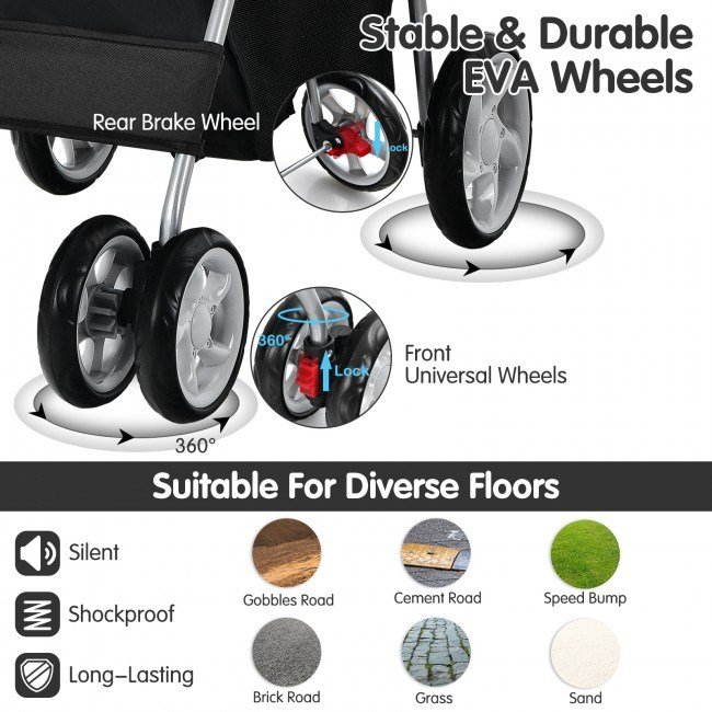 4.Convenient and Safe Design: The two front wheels can rotate 360 degrees, allowing smoother transport even on rocky roads. In addition, four wheels are made of EVA, which is wear-resisting. When both safety brakes in the rear wheels are fixed, this pet stroller does not slip away.