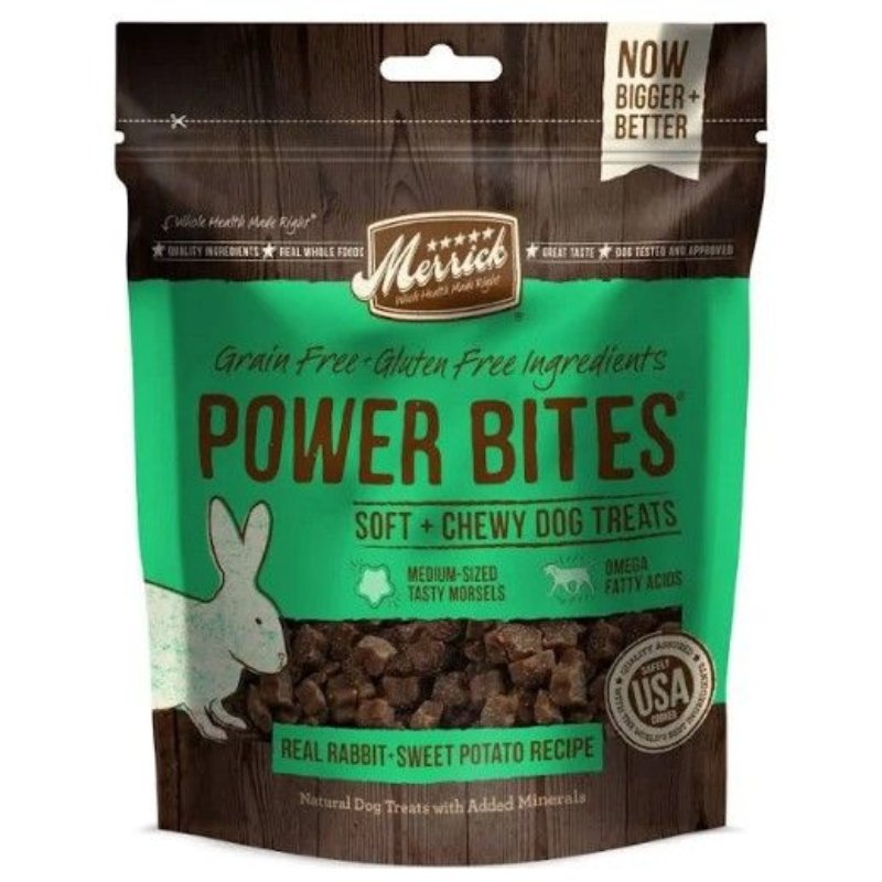 Merrick Grain Free and Gluten Free Dog Treats with Real Rabbit and Sweet Potato is Grain-free and gluten-free, without sorbic acid. Merrick Power Bites are soft and chewy all-natural treats, with big taste and industry-leading levels of powerful protein packed into every bite. These small star-shaped treats are perfect for training and rewarding dogs. Grain free and gluten-free, Merrick Power Bites start with real deboned meat, fish or poultry as the #1 ingredient plus fresh fruits and vegetables.