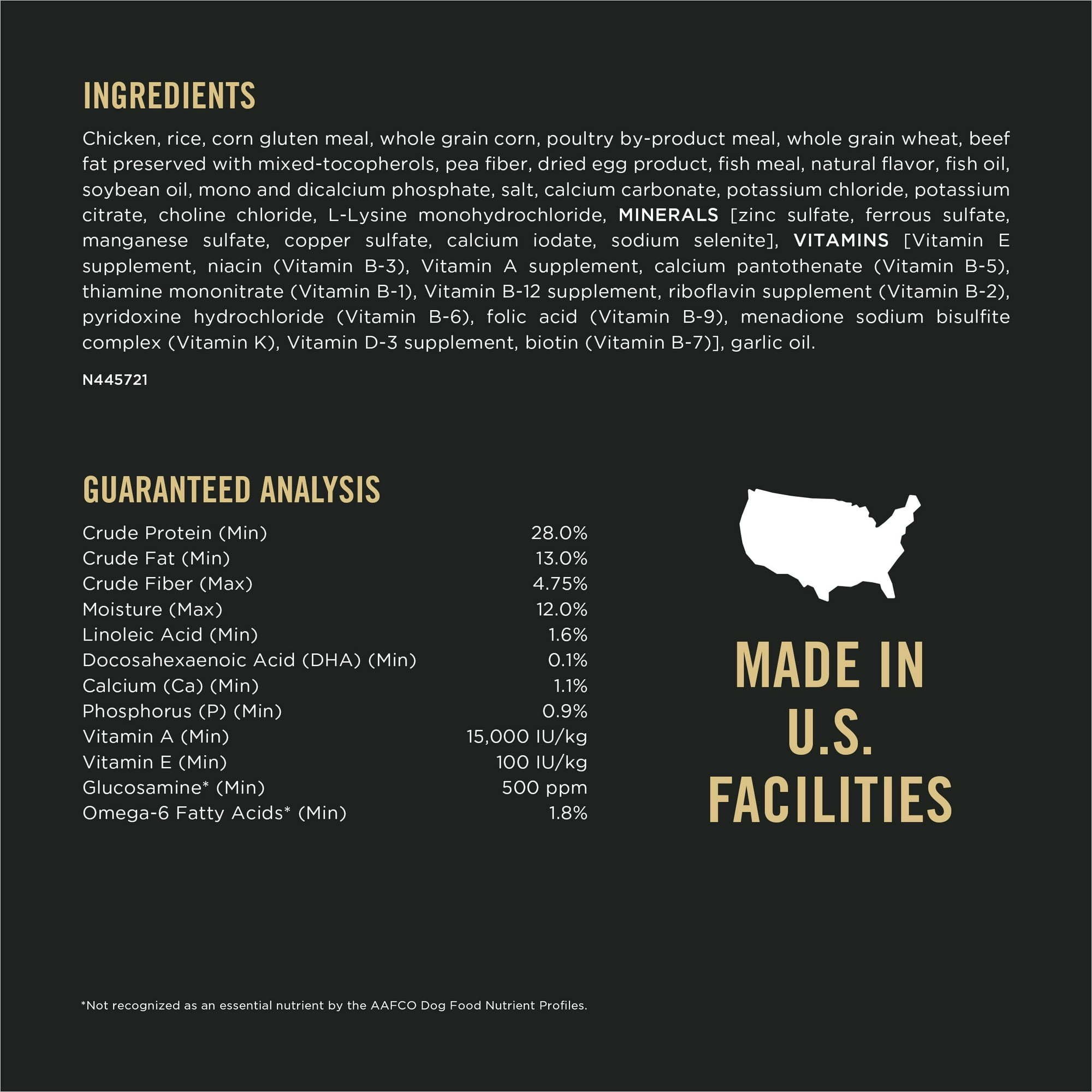 Purina Pro Plan Puppy Dry Dog Food for Puppies Under 2 Years, Nourish your large breed puppy with the wholesome nutrition he needs by serving him Purina Pro Plan Brand Dog Food Puppy Large Breed Chicken and Rice Formula dry puppy food. High-quality protein, including chicken as the number 1 ingredient, provides the building blocks he needs to maintain his active lifestyle. The special, nutrient-rich formula is designed for puppies weighing over 50 pounds at maturity. Every high-quality ingredient in this super-premium large breed dry puppy food is carefully chosen for a specific nutritional or functional purpose. DHA from omega-rich fish oil nourishes brain and vision development, and antioxidants support your puppy's developing immune system.